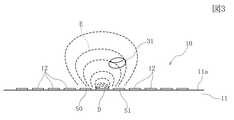 図1に示すように、それぞれの電極12は四角形でさらに詳しくは正方形であり、幅寸法W1,W2が10mm程度、隣接する電極12の間隔Sは2mm程度である。  As shown in FIG. 1, each