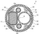 この湾曲駒組24の内部には、撮像ユニット11から延在する信号ケーブル11a、ライトガイド12a、及び、処置具挿通チャンネル13が、先端部6内と略同様の配置にて挿通されている。また、湾曲駒組24を構成する所定の湾曲駒25には、挿入軸O周りの回転配置が上述の各ワイヤ固定部21と略同様となる位置に、各アングルワイヤ23をそれぞれ挿通するワイヤガイド(図示せず)が形成されている。さらに、湾曲駒組24の外周は、先端部6側から延在する湾曲ゴム22によって覆われている。  Inside the bending piece set 24, a