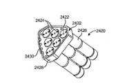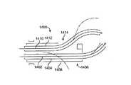 図13および図14は、第10の低侵襲性外科手術用器具アセンブリ1300(図13)の局面と、第11の低侵襲性外科手術用器具アセンブリ1400(図14)の局面とを例示する概略図である。外科手術用器具アセンブリ1300および外科手術用器具アセンブリ1400は、図3〜図12Bと、関連付けられる記述とに例示された外科手術用器具の局面を組み合わせている。特に、器具アセンブリ1300は、1つ以上の外科手術用器具1302が、誘導チューブ1306の遠位部分1304の端を出て行き、そして、1つ以上の他の外科手術用器具1308が、誘導チューブ1306の遠位部分1304においてポート1310から出て行く局面を例示している。同様に、器具アセンブリ1400は、1つ以上の外科手術用器具1402が、二次誘導チューブ1408の遠位部分1406の端を出て行く1つ以上の一次誘導チューブ1404の中で同軸に延び、そして、1つ以上の他の外科手術用器具1410が、二次誘導チューブ1408の中で同軸に延び、二次誘導チューブ1408の遠位部分1406において1つ以上の側面出口ポート1414から出て行く1つ以上の一次誘導チューブ1412を通って同軸で延びている局面を例示している。追加のチャネルと、能動的な可撓性および受動的な可撓性と、係止/硬化と、様々なDOFと、横方向に加える力の増加および堅さの増加と、手首メカニズムの任意の使用と、器具の相互交換可能性と、カニューレと、内視鏡的画像化システムとに関する上の記述は、器具アセンブリ1300および器具アセンブリ1400に適用される。  FIGS. 13 and 14 are schematics illustrating aspects of a tenth minimally invasive surgical instrument assembly 1300 (FIG. 13) and aspects of an eleventh minimally invasive surgical instrument assembly 1400 (FIG. 14). FIG.