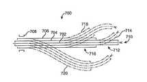 図7において代替の位置線によって示されたように、一次誘導チューブおよび二次誘導チューブは、単純な曲りと複合的な曲りとの様々な組み合わせを用いてエンドエフェクタ710を動かし得る。1つの例示的な実施形態において、二次誘導チューブ702の能動的な可撓性が、エンドエフェクタ710の比較的に大きな運動に対して使用され、一次誘導チューブの遠位部分712の能動的な可撓性が、エンドエフェクタ710の比較的に小さい、手首型の運動に対して使用される。かかる運動の量は、遠位部分712が、二次誘導チューブ706を越えて延びる距離に依存し、したがって、図2Bに記述された運動と似た運動を提供し得る。  As indicated by alternative position lines in FIG. 7, the primary and secondary guide tubes may move the
