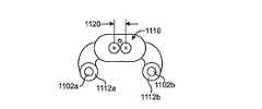 図11Aおよび図11Bは、外科手術用器具アセンブリの概略的端面図であり、図11Aおよび図11Bは、アセンブリ1000(図10)およびアセンブリ1100(図11)などの側面出口アセンブリが、誘導チューブまたは二次誘導チューブの全体的な断面積を減少させるために使用され得るということを例示している。図11Aは、アセンブリ800などのアセンブリの例示的な図であり(円形の断面形状が、単に例示されている)、図11Aにおいては、器具806a/誘導チューブ802aの組み合わせと、器具806b/誘導チューブ802bの組み合わせとが、誘導チューブまたは二次誘導チューブの遠位端から出て行く。この例示的な例において、画像化システム812は、画像化ポートと例示的な照明ポート1122との間の2レンズの中心間の距離1120を有するステレオスコープ画像化システムである。図11Bの例示的な例に示されているように、側面出口アセンブリの器具1102a/遠位誘導チューブ部分1112aの組み合わせと、側面出口アセンブリの器具1102b/遠位誘導チューブ部分1112bの組み合わせとは、図11Aに示された、802a、806aの組み合わせおよび802b、806bの組み合わせと同じ断面寸法を有する。そして、例示的なステレオスコープ画像化システム1116は、図11Aに示されたような画像化システム812と同じ、2レンズの中心間の距離1120を有する。内視鏡画像が、誘導チューブの遠位端においてキャプチャされ、デジタル化される場合には、画像キャプチャコンポーネントおよび画像デジタル化コンポーネントの近くの誘導チューブの範囲が、光学機器(例えば、ファイバーバンドル、ロッドレンズなど)の代わりに、器具および作動のために使用され得る。結果として、図11Bの側面出口誘導チューブの長円形状の断面積は、図11Aの側面出口誘導チューブの断面積よりも小さく、そして、画像化システムの2レンズの中心間の距離は同じである。この断面積の減少は、例えば、使用される切開のサイズおよび場所に関して、特定の元々の開口のサイズに関して、または入口ポートと外科手術部位との間の中間の組織の位置に関して有利であり得る。かかる長円の断面形状は、本明細書において記述される他の器具アセンブリの誘導チューブにおいて使用され得る。  11A and 11B are schematic end views of a surgical instrument assembly, and FIGS. 11A and 11B show that a side outlet assembly such as assembly 1000 (FIG. 10) and assembly 1100 (FIG. It illustrates that it can be used to reduce the overall cross-sectional area of the secondary guide tube. FIG. 11A is an exemplary view of an assembly, such as assembly 800 (a circular cross-sectional shape is merely illustrated), and in FIG. 11A, the combination of