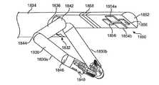 図18Cは、器具アセンブリ1800と器具アセンブリ1801との局面を組み込む低侵襲性外科手術用アセンブリの実施形態の概略的斜視図である。図18Cに示されているように、2つの外科手術用器具1830aおよび外科手術用器具1830bは、それぞれが、硬く可動な遠位リンクを有し、誘導チューブ1834の中間の位置1832から延びている。各器具1830aおよび器具1830bは、上側アームリンク1836と、下側アームリンク1838と、エンドエフェクタ1840(例示的なグラスパが示されている)とを含む。肩関節1842は、上側アームリンク1836を器具本体(図示せず)に結合し、該器具本体は、誘導チューブ1834を通って戻るように延びている。肘関節1844は、上側アームリンク1836を下側アームリンク1838に結合し、そして、手首関節1846は、下側アームリンク1838をエンドエフェクタ1840に結合する。一部の局面において、図16A〜図16Jを参照して上に記述されたような平行運動メカニズムが、使用され得、そして、別の局面において、肩関節および肘関節が、独立して制御され得、手首関節1846も同様である。一部の局面において、単一のアームリンクだけが、使用され、他の局面において、3つ以上のリンクが、使用される。一部の局面において、1つの肩関節1842または両方の肩関節1842が、誘導チューブ1834に固定されるので、関連付けられる器具本体は、存在しない。  FIG. 18C is a schematic perspective view of an embodiment of a minimally invasive surgical assembly that incorporates aspects of