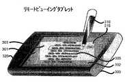 図2は、ディスプレイ301と、セットトップボックスにおいてユーザインタフェースを更新するのに用いられるタッチスクリーン302とを備えたビューイング装置又はタブレット300を示す。タッチスクリーン302は、ボタン又はロッカスイッチ320によって、又は図6aのスクリーンコーナー302aなどの特定のスクリーン位置をタッチすることによって、起動されてもよい。スイッチ320は、所望されるSTB制御機能間の選択をするため、ダブルプッシュ、トゥ・アンド・フロロック(to  and  fro  rock)、又は持続的な起動を可能にする。特定のスクリーン位置の使用は、ユーザが、STBメニューや番組ガイドなどの何れのSTB機能を制御することを所望するか選択するのに利用されてもよい。さらに、ダブルスクリーンタッチ又は持続的なタッチは、二重の制御機能を提供するものであってもよい。例えば、ダブルタッチ構成によって、最初のスクリーンタッチは、リモートビューワにより制御されるオンスクリーン画像(OSD)部分を決定する。2回目のタッチは、例えば、ダブルタッチコマンドとして認識されるため、特定の相対的に短時間のウィンドウ内で行われることが要求されてもよく、この2回目のタッチは、エンター、起動又はコマンド決定を表すものであってもよい。同様に、持続的なタッチ構成は、例えば、制御対象のオンスクリーン画像(OSD)部分を決定し、延長されるが、相対的に短いタッチ時間に従うことは、エンター、起動又はコマンド決定を表すものであってもよい。ダブルタッチや持続的なタッチのユーザ制御に加えて、スクリーン302は、効果的には、所与のインターバルにおいて複数のスクリーン検知エリア又はセル上を指やスタイラスを単にドラッグすることによって、上下左右をスクロールする機能を提供するようにしてもよい。例えば、限定数のセル上の短いドラッグは、同様の時間インターバルにおけるより多数のセル上のドラッグがオンスクリーン画像にページを変更させる、すなわち、番組ガイドの以降のイベントにスクロールさせるオンスクリーン画像位置のわずかな変更を生じさせるものであってもよい。  FIG. 2 shows a viewing device or