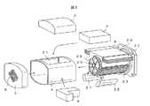 また、図2に、上記したカバー1の内部に収納する回転電機部分とインバータの各部の展開図を示す。図2において、9は回転電機のハウジングであり、その外周表面の一部には冷却フィン22が形成されている。また、ハウジング9の内部には、図では見えないが、回転電機の固定子と回転子が挿入されており、24は、上記したエンドブラケット5とは反対側において、ハウジング9の端部に取り付けられたエンドブラケット、25は、エンドブラケット24の外側で上記回転軸6に取り付けられる遠心ファンである。また、ハウジング9の平面23には、カバー1の一部に設けられた開口部21を介して、インバータ7が取り付けられ、その後、その保護のためのカバー3が外側から取り付けられている。また、インバータは、発熱素子であるパワースイッチング素子等を有しているので、それらの発熱状況を監視し保護をかける目的で温度検出器が設けられている。26は制御&I/F基板用ケース、27は平滑コンデンサ用ケースである。そして、ハウジング9の他の端部(図の左端)には、上述した冷却カバー2が取り付けられる。また、図中の符号8は、当該冷却カバー2の壁面の略中央部に、メッシュ状に形成した、外部の空気を取り入れるために小孔を示している。
