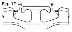 図7〜図10は、導通路124および126(ならびに/または、折り畳み可能な開口134の一方の側のみ、もしくは、両側の導通路128および130)に取って代わることができる開口部の他の実施形態を示している。図7は、上部で開いて垂直な壁を備える単一の凹部または凹面136を有する締結部材を示している。図8は、上部で開いた一対の凹部または凹面138を有する締結部材を示している。図9は、単一の開口部140を有する締結部材を示しており、その単一の開口部140は、開口部の主部の上方に配置されると共にその主部と連通する狭められた口部または隙間142を形成するために、上向きに先細りとなっている。開口部は、開口部において包囲部材を保持するように構成された口部142の唇部144で、包囲部材を2回受け入れるような大きさとされ得る。ある実施形態では、開口部140は、囲まれた周囲部を形成するために、上部において閉じられてもよい。図10は、一対のU字形の開口部146を有する締結部材を示している。各々の開口部の留め領域または唇部148は、開口部において包囲部材を保持できる。 FIGS. 7-10 show other paths that can replace the