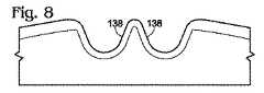 図12は、架設軸線118と平行に見るとき、対称の輪郭を有する突起150を示している。各々の突起の輪郭は、内側162および外側164の両方において、凹面、直線状、または凸面であってもよい。 FIG. 12 shows a