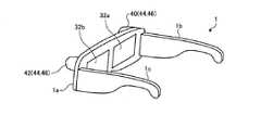 前面部1aは、表示部32aおよび表示部32bが設けられている面とは反対側の面に撮影部40および撮影部42を備える。撮影部40は、前面部1aの一方の端部(装着時の右目側)の近傍に配設され、撮影部42は、前面部1aの他方の端部(装着時の左目側)の近傍に配設される。撮影部40は、利用者の右目の視界に相当する範囲の画像を取得する。撮影部42は、利用者の左目の視界に相当する範囲の画像を取得する。ここでいう視界とは、例えば、利用者が正面を見ているときの視界である。  The