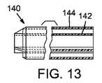 図12〜図14は、別の実施形態による取付部材140を示す。取付部材140は、円筒形内壁142と、円筒形外壁144と、内壁および外壁を分ける角度的に間隔をおいて配置された複数のリブ146とを備える。内壁142は、バルーン内のシャフト34の外面に固定される。特定の実施形態では、取付部材140は、人工弁がバルーン上へ移動させられるときに半径方向に圧縮しない比較的硬質の材料(例えば、ポリウレタンまたは別の適切なプラスチック)で作製することができる。図16に示されるように、バルーンの膨張中、バルーンの近位セクションにおける膨張流体は、矢印128の方向に、取付部材の内壁と外壁の間の空間148を通じて近位ノーズコーン部分126内の1つまたは複数のスロット130を通ってバルーンの遠位セクションの中に流れることができる。  12-14 show a mounting