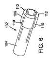 図6および図7に最もよく示されるように、コレット102は、遠位端部分104と、拡大近位端部分106と、バルーンカテーテルシャフト26を受け入れる管腔108とを備える。複数の軸方向に延びる周方向に間隔をおいて配置されるスロット110は、コレットの近位端から遠位端部分104上の位置まで延び、それによって複数の可撓性フィンガ112を形成する。近位端部分は、プッシャ要素100の対応するテーパ状端面に係合するテーパ状端面114を形成することができる(図2A)。  As best shown in FIGS. 6 and 7, the