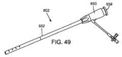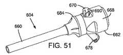 ハンドル606の構成は、図48に示されている。ハンドル606は、ハウジング634を含み、ハウジング634は、複数のハウジングセクションから形成され得る。ハウジング634は、シャフト608の関節/反りの効果的な制御を行う機構を収容する。例示の実施形態における機構は、ねじ付きシャフト636と、このシャフトに設けられるねじ付きナット638とを含む。シャフト636の近位端部分は、ねじ付きナット638の雌ねじに係合する雄ねじが形成されている。シャフト636は、ハンドル内で回転できるが、ハンドル内の平行運動は規制される。ナット638は、対向するフランジ640を有し(図48にはその一方が示されている)、フランジ640は、ハウジングの内部面に形成されたそれぞれのスロットの中に延びてナットの回転を防ぐ。このようにして、ナット638は、シャフトの回転に基づいてシャフト636のねじに沿って平行移動する。  The configuration of the