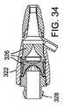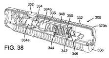 ハウジング332は、ハンドルが使用者の手によって握持されるときに、ハンドルの内部の反り(関節)機構を作動させるように構成される。例えば、ハウジング332は、下側ハウジングセクション368と、上側ハウジングセクション370とを備えることができ、上側ハウジングセクション370は、組立てを容易にするために2つの別個のハウジングセクション370a、370bから構成することができる。図36を参照すると、下側ハウジングセクション368は、矢印374によって示されるように、使用者の手によって握持されるときに、2つのセクションが限られた距離だけ互いに向かっておよび互いから離れるように移動することを可能にするやり方で上側ハウジングセクション370に取り付けられている。ねじりばね338は、上側ハウジング部分370の内面に当接する一方のアーム376aと、下側ハウジング部分368の内面に当接する別のアーム376bとを有し、弾性的に2つのハウジング部分を互いから離れるようにさせる。したがって、ハンドルの握持によって上側ハウジング部分および下側ハウジング部分を共に移動させ、手の圧力を解放すると、ばね力による限られた量だけハウジング部分が互いから離れるように移動することができる。代替的実施形態では、ハウジングの一部は、反り機構を作動させるために使用者の手によって握持されるときに変形できる可撓性または変形可能な材料で作製することができる。  The