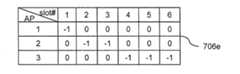 例えば、スケジューリングテーブル706は、アクセス制御装置600の制御下にある全てのアクセスポイント602を一意に識別する識別情報を行に、タイムスロット202を列に持ち、各セルには、無線端末603を一意に識別する識別情報、0、又は、−1を格納する、テーブルである。また、スケジューリングテーブル706は、当該アクセスポイント602の周波数チャネル情報を行に持ってもよい。  For example, the scheduling table 706 has identification information for uniquely identifying all