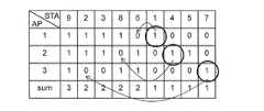 例えば、全AP衝突テーブル704は、アクセス制御装置の制御下にある全てのアクセスポイント602を一意に識別する識別情報の一覧を行に、本実施例における無線伝送システムに含まれる全ての無線端末603を一意に識別する識別情報の一覧を列に持ち、各セルには0又は1を格納するテーブルである。  For example, the all AP collision table 704 includes a list of identification information for uniquely identifying all the