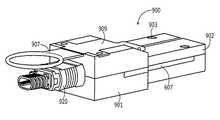 図9及び図10を参照すると、本発明のトランシーバ900の一実施形態が示される。具体的には、トランシーバは、上述した光組立体600を具備する。光組立体600を取り囲むのは、本実施形態では下ハウジング901及び上ハウジング902からなるハウジングである。これらのハウジングは、例えば、上ハウジング902及び光組立体600を通過して下ハウジング901内に入るよう構成されたピンを含む公知の手段を用いて固定される。これにより、下ハウジング901及び上ハウジング902の双方を同時に固定しながら、ハウジングにサブ組立体を固定する。  Referring to FIGS. 9 and 10, one embodiment of the