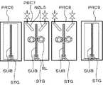 そして、洗浄室PRC5内には、基板支持部STGの他に、ノズルNZL3,NZL4が設けられている。ノズルNZL3は、基板SUBの表面に、純水を供給する、ノズルNZL4は、基板SUBの表面にIPA(isopropyl alcohol)の蒸気を供給し、基板SUBの表面を乾燥させる。 In the cleaning chamber PRC5, nozzles NZL3 and NZL4 are provided in addition to the substrate support portion STG. The nozzle NZL3 supplies pure water to the surface of the substrate SUB. The nozzle NZL4 supplies vapor of IPA (isopropyl alcohol) to the surface of the substrate SUB to dry the surface of the substrate SUB.
