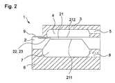 さらに本発明の測定素子1は、検知素子2に埋め込まれている抵抗パターン22および導電部23を備える。これらの抵抗パターン22および導電部23は、圧力測定のための測定ブリッジを形成する。  Furthermore, the measuring element 1 of the present invention includes a resistance pattern 22 and a conductive portion 23 embedded in the