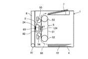 なお、給紙部4を装置本体1の上方側に配置し、排紙トレイ7を装置本体1の下方側に配置して、搬送機構部5が垂直方向上方から下方に向けて用紙10を搬送しながら画像形成を行う構成とすることもできる。  The paper feeding unit 4 is arranged on the upper side of the apparatus