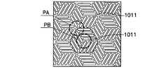 また、第1ユニットKUと第2ユニットTUとが鏡面(鏡像)対称である関係とは、図4Bに示すように、対称軸MGを挟んで一方側に仮想的な正六角形の第1ユニットKUが位置したときの第1領域Ar1〜第3領域Ar3の配置が、対称軸MGの他側に鏡像として写されたときに鏡面対称の位置となる第1領域Ar1〜第3領域Ar3の配置となる仮想的な正六角形の第2ユニットTUである関係をいう。そして、頂角を起点にした第2ユニットTUを平行移動させて第1ユニットKUの各辺に合せるように配置している。例えば、図3に示すように、第1ユニットKUの辺Ha1に第2ユニットTUの辺Hb6を合せ、同様に、辺Ha2に辺Hb5に合せ、辺Ha3に辺Hb4に合せ、辺Ha4に辺Hb3に合せ、辺Ha5に辺Hb2、辺Ha6に辺Hb1を合せるようにしている。 Further, the relationship in which the first unit KU and the second unit TU are mirror-surface (mirror image) symmetrical is, as shown in FIG. 4B, a virtual regular hexagonal first unit KU on one side across the symmetry axis MG. The arrangement of the first area Ar1 to the third area Ar3 when the first area Ar1 to the third area Ar3 are mirror-symmetrical when the arrangement of the first area Ar1 to the third area Ar3 is mirrored on the other side of the symmetry axis MG. The relationship is a virtual regular hexagonal second unit TU. And it arrange | positions so that the 2nd unit TU which made the vertex angle the starting point may be moved in parallel, and it may match with each edge | side of the 1st unit KU. For example, as shown in FIG. 3, the side Hb6 of the second unit TU is aligned with the side Ha1 of the first unit KU, similarly, the side Ha2 is aligned with the side Hb5, the side Ha3 is aligned with the side Hb4, and the side Ha4 is aligned with the side Ha4. According to Hb3, side Hb2 is aligned with side Ha5, and side Hb1 is aligned with side Ha6.