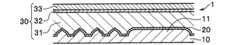 窒化物半導体層30は、発光素子1の発光部を構成するものであり、例えば、InXAlYGa1−X−YN(0≦X,0≦Y,X+Y≦1))等の窒化物半導体が用いられる。窒化物半導体層30は、図1に示すように、サファイア基板10のc面(主面)上にバッファ層20を介して形成されており、n型半導体層31、活性層32及びp型半導体層33が下からこの順に積層された構造を有している。活性層32は、例えば井戸層(発光層)と障壁層とを有する量子井戸構造である。The