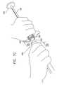 図7Bおよび8Bは、カラー304が装置100と対向した状態で、一方の手で装置100を保持し、他方の手で補助内視鏡アセンブリ300を保持するユーザを示している。この段階で、駆動用アセンブリ106は、手動係合可能要素102に対して完全に引き込められていることに留意する。この段階で、ユーザの手は、アーム要素108の外向きエッジ面206および220にかけられて、アーム要素108のカラー係合エッジ面212がほぼ先端が切り取られていない錐体を画定し、それによって、図7Cおよび8Cに見られるようにカラー304内に挿入され、カラー304を部分的に伸張させることができるように可能な限り最大に、スプリング114による付勢に対抗して、アーム要素108の外向きエッジ面206および220を半径方向内向きに押すことにも留意する。  FIGS. 7B and 8B illustrate a user holding the