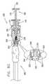 図7Eおよび8Eは、手動係合可能要素102に対する、駆動用アセンブリ106の僅かな前方軸方向変位を示している。この前方変位は、カラー係合要素120のハブ230のエッジ面246および248と、対応する内向きエッジ面208との間の係合が強制的にアーム要素108を要素102におけるボア190内でピン110を中心に半径方向外向きに回動させるようにカラー係合要素120を軸方向前方へ移動させ、それによって、フィンガー部分210のカラー係合エッジ面212によって画定される錐体をさらに拡張し、カラー304をさらに伸張させる。  FIGS. 7E and 8E show a slight forward axial displacement of the