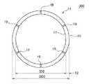 心臓弁輪固定手術用リング300は、円環状の剛体11からなる。剛体11は、いわゆるドーナツ形であり、概略として、回転軸(剛体11の中心軸)から所定の間隔を置いて回転軸と平行な平面に配置した円を回転軸の周りに1周させた、回転対象の3次元図形をなす。すなわち、剛体11は、剛体11がなす円周の外側に向かう凸面15と、剛体11がなす円周の内側に向かう凸面17とを有する。剛体11の中心軸とは、心臓弁輪固定手術用リング300がなす円周の中心を通り、円周がなす面に垂直な軸を言う。  The heart valve annulus-fixing