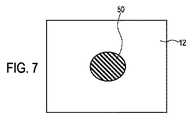 図6は、第1実施形態と同様に、第1有機層又は領域10が、シャドーマスクを介して基板12上にコーティング又は堆積される第1ステップの後のOLED構造の上面図を示す。上記と同様に、これは、シャドーマスク蒸着と呼ばれるスモールスケール技術、又は大面積にわたっての高品質のOLEDピクセルを実現するシャドーマスクプリンティング及びインクジェットプリンティングの特徴を兼ね備え得る他の技術等によって実現されてもよい。第1有機領域10は、カソードが存在し、アノードとカソードとの間に電圧が印加される場合、所定の色、例えば青色の光を出射するのに適している。  FIG. 6 shows a top view of the OLED structure after a first step in which a first organic layer or