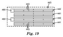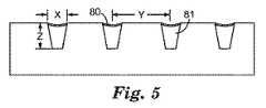 微小複製は、微小導電体を形成するのに使用することができる、更に別のプロセスである。図5の図は、充填された又は部分的に充填された、微小複製されたチャネルの断面図を示す。チャネルは、種インク81で充填され、次にこれらを導電性にするために、めっきされてもよい(金属化層80参照)。あるいは、チャネルには、それ自体が導電性であるインクが充填されてもよく、めっきプロセスの必要性を排除する。第3の代替手段は、基材を金属でコーティングし、次に溝の(底部の)金属の部分をマスキングし、次にマスキングされていない材料をエッチングして取り去ることである(例えば、米国特許出願第61/076731号(「Method  of  Forming  a  Microstructure」)、及び同第61/076736号(「Method  of  Forming  a  Patterned  Substrate」)を参照)。チャネルの実際の形状が変更されて、断面形状、及び最低水準の光学的干渉を提供する寸法を最適化し、一方で依然として高い伝導度及び高い生産収率を確実にすることができる。  Microreplication is yet another process that can be used to form microconductors. The diagram of FIG. 5 shows a cross-sectional view of a microreplicated channel that is filled or partially filled. The channels may be filled with