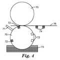 グラビア印刷は、印刷される画像が、ドラム上で回転する金属プレートに「エッチング」されることを必要とする。ドラムが回転すると、エッチングされた表面にインクが充填され、これは次に、インクを充填されたエッチングプレートとフィルムが互いに接触するとき印刷される、フィルムの表面上に堆積される。このプロセスは、図4で略図化されており、これはフィルム基材76が、インク槽73からのインクライン74で印刷されているのを示す。圧胴70は、インク槽73からのインクで充填されるエッチング72を有する、印刷ドラム75に接して回転する。このようなプロセスは、後の処理のためのストック材料を作るために使用することができ、又は高容量センサの特定のX又はY構成要素を作製するために使用され得る。  Gravure printing requires that the image to be printed be “etched” into a metal plate that rotates on a drum. As the drum rotates, the etched surface fills with ink, which is then deposited on the surface of the film that is printed when the ink filled etch plate and film contact each other. This process is schematically illustrated in FIG. 4, which shows a