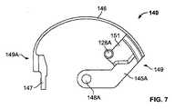 取出アセンブリ130は、図7、図7Aおよび図7Bに示されている取出部材140をさらに備えている。取出部材140は、その全体が丸く形作られている。図7および図7Aを最初に参照すると、取出部材140の前面図および前方斜視図が、それぞれ、示されている。図示されているように、取出部材140は、剛性のある第1端149および剛性のある第2の端149Aを有しているが、第1および第2の端149,149A間に延在しているアーム部146は、可撓性を有している。アーム部146の可撓性によって、取出部材140が通路133B内により容易に装着され、通路133B内をより容易に移動することが助長されることになる。図7Aに最もよく示されているが、第1の端149において、アーム部146は、Iビーム状の輪郭を有している。以下にさらに詳細に説明するように、Iビーム状輪郭の縁112は、アーム140が通路133Bの形状によって画定された予め選択された経路に沿って移動することを確実にするのに役立つことになる。  The