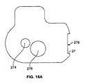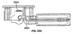力Fがカバー部212に加えられると、ポスト276A,276B(図18)は、カバー部212に加えられた力によって移動し、これによって、腎臓状開口282の縁282Aがポスト276A,276Bを捕捉し、腎臓状開口282に沿ったポスト276A,276Bの運動を可能にする。取出部材216は、取出部材216を貫通するピン(図示せず)を中心として回転し、その結果、試験紙260Aは、その「静止」位置から取出位置に移動することになる。図22に最もよく示されているように、この位置において、試験紙260Aは、カバー部212と向き合っており、貯蔵ユニット230内のさらなる試験紙260が脱落しないように、取出部材の基部が貯蔵ユニット230を覆っている。次いで、試験紙は、当技術分野において知られているどのような従来の手段を用いて、カートリッジから取り出されてもよい。例えば、試験紙の取出しを可能にする追加的な開口がカバー部212に設けられていてもよい。代替的に、試験紙260Aがカバー部212の開口から外に押し出されるようになっていてもよい。  When force F is applied to the