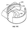 後方斜視図である図17Cに最もよく示されているように、壁209は、丸くなっており、円形基部215の形状または輪郭に似ている。壁209は、第1の外面211および第1の外面211から離間した第1の内面213も備えている。加えて、壁209は、取出ハウジング214の内部に面する通路をさらに備えている。この通路は、第1の壁217と向き合う壁209に沿って延在している。  As best shown in FIG. 17C, a rear perspective view, the