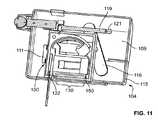 カートリジ100は、多数の試験を1つのカートリッジ100のみを用いて行うことを可能にするマルチ試験紙メーター内に組み込むことができる。1つの概略的な例では、図11に示されるように、カートリッジ100は、試験メーターのハウジング内に配置されるとよい。カートリッジ100のタブ111がハウジングに固定され、これによって、カートリッジ100の外側ハウジング150がカバー部122から離れる方に移動可能になっている。図示されているように、作動ボタン115および作動アーム116を備えるアクチュエータ104が、カートリッジ100のタブコネクター111に取り付けられているとよい。力が作動ボタン115に加えられると、外側ハウジング内に配置された取出アセンブリ130が作動し、外側ハウジング150がカバー部122から離れる方に移動する。これによって、取出部材140は、「静止」位置または第1の位置から「取出」位置または第2の位置に移動することになる。その結果、試験紙160Aがカートリッジ100の開口およびメーターハウジング109から取り出される。この例では、試験紙160Aは、すでに取り出されており、取出部材140は、カートリッジの開口の入口に近いその「取出」位置から、その「静止」位置に戻っている。従って、他の試験紙160Aを取り出す準備が整っていることになる。この例では、作動アーム116は、撃鉄解除部119にも接続されている。撃鉄解除部119は、突刺具121を撃鉄位置から解除し、突刺具121をメーターハウジングから突出させるようになっている。突刺具121は、指または他の体部分を突き刺し、流体試料を試験紙160Aにもたらすために用いられるものである。  The