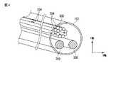 図4は、光ファイバ302の内視鏡への取り付け構造を示す図である。図4の例において、光ファイバ302は、挿入部112の内部に複数束ねられて配置されている。図4に示すX軸方向の湾曲とY軸方向の湾曲とをそれぞれ検出するために、X軸方向の湾曲を検出する湾曲検出部304とY軸方向の湾曲を検出する湾曲検出部304とが対となるように2本の光ファイバ302が配置されている。さらに、対となっている湾曲検出部304が挿入部112の長手方向(挿入方向)に並んで配置されるように、複数の光ファイバ302が配置されている。また、湾曲検出部304は、挿入部112の先端の近傍まで形状が検出できるように長手方向に並ぶように配置される。  FIG. 4 is a diagram showing a structure for attaching the