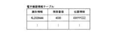 図3は、電子機器情報記憶部22が記憶する電子機器情報のデータ構成の例である。同図に示すように、電子機器情報テーブルは、電子機器50ごとの電子機器情報を格納している。電子機器情報は、電子機器50を識別する識別情報と、第1の蓄電池51の残容量を表す残容量値と、電子機器50の位置を表す位置情報(例えば、緯度および経度を表す測位情報)とを関係付けて含む。同図の電子機器情報テーブルには、識別情報“KLZ028AAA”と、残容量値“4500”(単位は、mAh)と、位置情報“XXXYYYZZZ”とを含む電子機器情報が含まれている。  FIG. 3 is an example of a data configuration of electronic device information stored in the electronic device