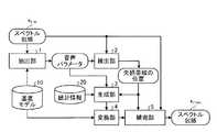 なお、本実施形態では、統計情報20として不特定話者GMMを使用することを想定している。しかし、不特定話者GMMのほかに、複数の特定話者GMMを統計情報20として用いてもよい。この場合、生成部3は、入力音声のスペクトル包絡χt_inから抽出された音声パラメータに最も適合した特定話者GMM、または適合度に合わせて複数の特定話者GMMを線形結合したものを用いて、欠損帯域に対応する音声パラメータの生成を行う。これにより、欠損帯域の音声パラメータを、入力音声のスペクトル包絡χt_inから抽出された音声パラメータに適合するように生成することができる。  In the present embodiment, it is assumed that an unspecified speaker GMM is used as the