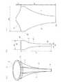 図2は,本発明の人工弁の例を示す概念図である。図2(a)は,外観図を示す。図2(b)は,第1の弁葉の概念図を示す。図2(c)は,第2の弁葉の概念図を示す。図2に示されるように,本発明の人工弁は,第1及び第2の弁葉でリングを覆う必要がない。この人工弁は,第1の弁葉5又は第2の弁葉7がリング3と接続される領域が,リング3の30%以上99%以下の領域(又は35%以上90%以下の領域)であってもよい。上記の特許文献1(特許第5392539号公報)のものは,リングの半分程度の領域を2つの弁葉で覆っている。この例では,第1の弁葉(図2(b))及び第2の弁葉(図2(c))に幅が一定の部分が存在せず,上端から下端に向かうにしたがって幅が狭っているものの,その曲線には変曲点が複数存在している。すなわち,弁葉の形状は,一様に狭くなるものでなくてもよく,下端に向かう途中において幅が広くなるものや,起伏に富んだものであっても構わない。  FIG. 2 is a conceptual diagram showing an example of the artificial valve of the present invention. FIG. 2A shows an external view. FIG.2 (b) shows the conceptual diagram of a 1st valve leaf. FIG.2 (c) shows the conceptual diagram of a 2nd leaflet. As shown in FIG. 2, the prosthetic valve of the present invention does not need to cover the ring with the first and second leaflets. In this artificial valve, the region where the