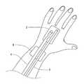 図4及び図5を用いて本実施形態の陰圧閉鎖用具の装着手順の一例を説明する。図4に示すように、まずは患部に被覆材3を配置する。その後、両面テープ6を手首部に貼付ける。その後、吸引管4及び洗浄管5を両面テープ6に貼付けることで固定する。両面テープ6があることで、吸引管4及び洗浄管5の固定がしやすくなり、患部周辺への位置決めが容易になる。続いて、図5に示すように手袋1を装着する。その後、図1に示すように医療用片面テープからなるシール手段2を手袋1の開口部に巻き付けることで手袋1内を気密状態にする。その後、吸引手段11を駆動して吸引管4を通じて、手袋1内を陰圧にする。手袋1内が陰圧になることで、吸引管4から膿等の体液を排出されると共に、洗浄管5から洗浄液や薬液が供給され、陰圧閉鎖療法により患部の治癒が促進される。  An example of the attachment procedure of the negative pressure closure device of the present embodiment will be described with reference to FIGS. As shown in FIG. 4, the covering