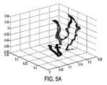 図5Aは、本発明の実施形態に係る、ベテランのタスク軌跡を示す図であり、図5Bは、本発明の実施形態に係る、新人のタスク軌跡を示す図である。図示しているタスク軌跡は、タスク軌跡において器具の器具軸に沿った線で画定される表面積に対応するとしてよい。どちらの軌跡も、共有基準系(例えば、ロボット系または「ワールド」系)に変換して比較できるようにしており、対応関係を見る。器具で画定される表面積(または「帯状領域」)は、さまざまなスキルのユーザを区別することを目的として、タスク、タスク時間、または、ユーザの好みに応じて設定可能であるとしてよい。 FIG. 5A is a diagram showing a veteran task trajectory according to the embodiment of the present invention, and FIG. 5B is a diagram showing a rookie task trajectory according to the embodiment of the present invention. The illustrated task trajectory may correspond to a surface area defined by a line along the instrument axis of the instrument in the task trajectory. Both trajectories are converted to a shared reference system (for example, a robot system or a “world” system) so that they can be compared, and the correspondence is viewed. The surface area (or “band”) defined by the instrument may be configurable according to task, task time, or user preference for the purpose of distinguishing users of different skills.