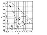 第1混色の色度(Pm1)を第1線上の目標色度(Pv)に近づけるように補正すると共に、第2混色の色度(Pm2)を目標色の色度(Pw)に近づけるように補正することを特徴としている。In the second invention, the first light source (201) that emits the first color, the second light source (202) that emits the second color, and the third light source (203) that emits the third color. In the light source unit (20) having the above, the mixed color chromaticity (Pm2) when the first to third light sources (201, 202, 203) are simultaneously turned on is set to have a predetermined light intensity ratio. A chromaticity correction device that corrects the chromaticity (Pw) of the target color to be close to the target color,