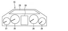 まず、メータ装置10について簡単に説明する。メータ装置10は、車両の走行時における各種車両情報を乗員に対して総合的に表示する装置である。メータ装置10の外観は、乗員側から見て、図1に示すようになっており、例えば、文字板に文字板照明部23、表示器24、速度計25、回転計26、燃料残量計27、および水温計28等が設けられている。  First, the
