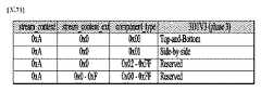シングルビデオストリームフォーマットとしては、サイドバイサイド(side−by−side)、トップ/ダウン(top/down)、インターレースド(interlaced)、フレームシーケンシャル(frame sequential)、チェッカーボード(checker board)、アナグリフ(anaglyph)などがあり、マルチプルビデオストリームフォーマットとしては、フル左/右(Full left/right)、フル左/ハーフ右(Full left/Half right)、2Dビデオ/奥行き(2D video/depth)などがある。 Single video stream formats include side-by-side, top / down (top / down), interlaced, frame sequential, checker board, anaglyph, etc. Multiple video stream formats include full left / right (Full left / right), full left / half right (Full left / Half right), 2D video / depth (2D video / depth), and the like.