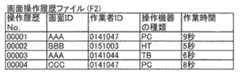 画面操作履歴ファイルF2は、操作履歴のそれぞれについて、画面IDと、作業者IDと、操作機器の種類と、作業時間とを関連付ける。画面IDは、図4に示す画面IDに対応する。作業者IDは、その操作を行った作業者を特定する識別情報であり、たとえば操作機器に対する事前のログイン操作等に応じて取得される。操作機器の種類は、図4に示す操作機器の種類に対応する。作業時間は、その操作履歴において、一連の操作に要した時間を表す。たとえば図5の例では、操作履歴No.00001として記録された操作履歴によれば、画面ID「AAA」に対応する画面インタフェース40が表示されてから、「新規登録」ボタンが操作されるまでに9秒の時間がかかったことが示されている。  The screen operation history file F2 associates a screen ID, a worker ID, a type of operation device, and a work time for each operation history. The screen ID corresponds to the screen ID shown in FIG. The worker ID is identification information that identifies the worker who performed the operation, and is acquired according to, for example, a prior login operation with respect to the operation device. The type of operating device corresponds to the type of operating device shown in FIG. The work time represents the time required for a series of operations in the operation history. For example, in the example of FIG. The operation history recorded as 00001 indicates that it took 9 seconds from the time when the