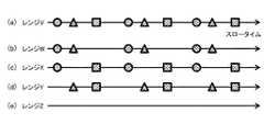レーダ装置1の送信動作では、図4に示すように、まず、信号生成部102は、チャープパルスを生成する(ステップST401)。この際、信号生成部102は、図6に示すように、チャープレートが異なる3種類の波形(直交符号または当該直交符号に順ずる符号)を順番に用いる。また、このときのPRIは、図7(a)に示すように、周期性を残しながら不等間隔とする。このPRIを具体的に説明すると、図7(b)〜(d)に示すように同一の波形によるパルスの間隔は常に一定となるように周期性を残しつつ、パルス間の間隔はブラインドレンジが拡散するように不等間隔とする。Next, a processing procedure of the radar system configured as described above will be described with reference to FIGS. First, the processing procedure of the