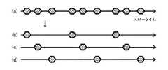 ここで、信号分離部201による信号分離処理を図8に示す。図8では、ある1点の目標からのエコーを示している。図8に示すエコーAは図7に示すパルスAに対するエコーであり、同様に、エコーBはパルスBに対するエコーであり、エコーCはパルスCに対するエコーである。そして、信号分離部201によりそれぞれのエコーを分離すると、送信側でPRIを周期性を残して不等間隔とした効果によって、図8(b)〜(d)に示すように、各エコーの系列が等間隔になる。この信号分離部201により分離された各信号系列(3つのエコーの系列)は信号復元部202に出力される。  Here, the signal separation processing by the