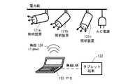 照明装置121a,121b,121cが電力線に接続され、各照明装置121a,121b,121cの明るさおよび方向を制御する調光コントローラとなる装置はタブレット端末122である。PC123に無線装置(ZigBee(登録商標)方式)を内蔵させ、タブレット端末122の画面上でタッチ入力方式で各照明装置の設定をして、方向指定などを制御するように構成されている。ダブレット端末122とPC123は無線LANにより接続され、調光信号などのデータの送信を行う。PC123は無線を用いるため、配置する位置は制限されず、無線電波124が届けば、照明装置が直接視認できない位置からでも操作が可能である。FIG. 12 is a schematic system diagram of a lighting device that performs dimming control wirelessly (hereinafter referred to as Conventional Example 3).
