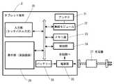 コントローラ部であるタブレット端末2は、液晶画面の表示部29,タッチ入力式の入力部28,アンテナ21,無線モジュール22,メモリ部23,制御部24,電源部25で構成されている。電源部25はタブレット端末2内の電気回路を駆動するためのDC電源である。家庭用AC100Vは充電器27によりタブレット端末2用のDC電源に変換され、電源部25はこのDC電源を充電し、各回路に対応のDC電圧を供給する。