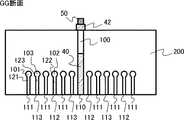 そして、第1の横方向ガス流路101に接続され縦方向に延伸し、反応室10側に第1のガス噴出孔111を有する複数の第1の縦方向ガス流路121を備える。また、第2の横方向ガス流路102に接続され縦方向に延伸し、反応室10側に第2のガス噴出孔112を有する複数の第2の縦方向ガス流路122を備える。第2の縦方向ガス流路122は、第1の横方向ガス流路101の間を通っている。さらに、第3の横方向ガス流路103に接続され縦方向に延伸し、反応室10側に第3のガス噴出孔113を有する複数の第3の縦方向ガス流路123を備える。第3の縦方向ガス流路123は、第1の横方向ガス流路101の間を通っている。また、中央横方向ガス流路100に接続され縦方向に延伸し反応室10側に中央ガス噴出孔110を有する複数の中央縦方向ガス流路120を備える。  A plurality of first
