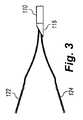 次に、図5を参照すると、把持組立体120が示されている。例示の実施形態では、上側及び下側把持具122,124は、最初は、ロッド125,127とは別体に形成され、例えばエポキシ樹脂又は他の適当な取り付け手段のような何らかの手段によって互いに取り付けられている。別の実施形態では、上側及び下側把持具122,124は、一対の電気的に隔離された(絶縁された)導体として形成される。例えば、図6では、ロッド125は、上側把持具122を導体166に連結している。さらに、ロッド127は、下側把持具124を導体168に連結している。かかる実施形態では、プラスチックオーバーラップは、オーバーラップ162,164として示されているように、各把持具について別々であるのが良い。かくして、把持組立体120は、上側及び下側把持具122,124の使用により焼灼(cauterization)を可能にするような導電性である双極性である。別の実施形態では、把持具に代えて、他のエンドエフェクタ又は作業ツールを用いることができる。例えば、治療部位への単一の電気導体を提供するべく、上側及び下側把持具122,124に代えて、尖っていない(blunt)先端を用いることができる。  Referring now to FIG. 5, the gripping