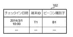 図5は、履歴情報162の一例を示す図である。履歴情報162は、チェックイン日時と、端末IDと、ビーコン識別子とを含む。チェックイン日時は、通信端末200がサーバ装置100にチェックインした日時である。端末IDは、通信端末200を識別する情報である。ビーコン識別子は、ビーコン300を識別する情報である。 FIG. 5 is a diagram illustrating an example of the